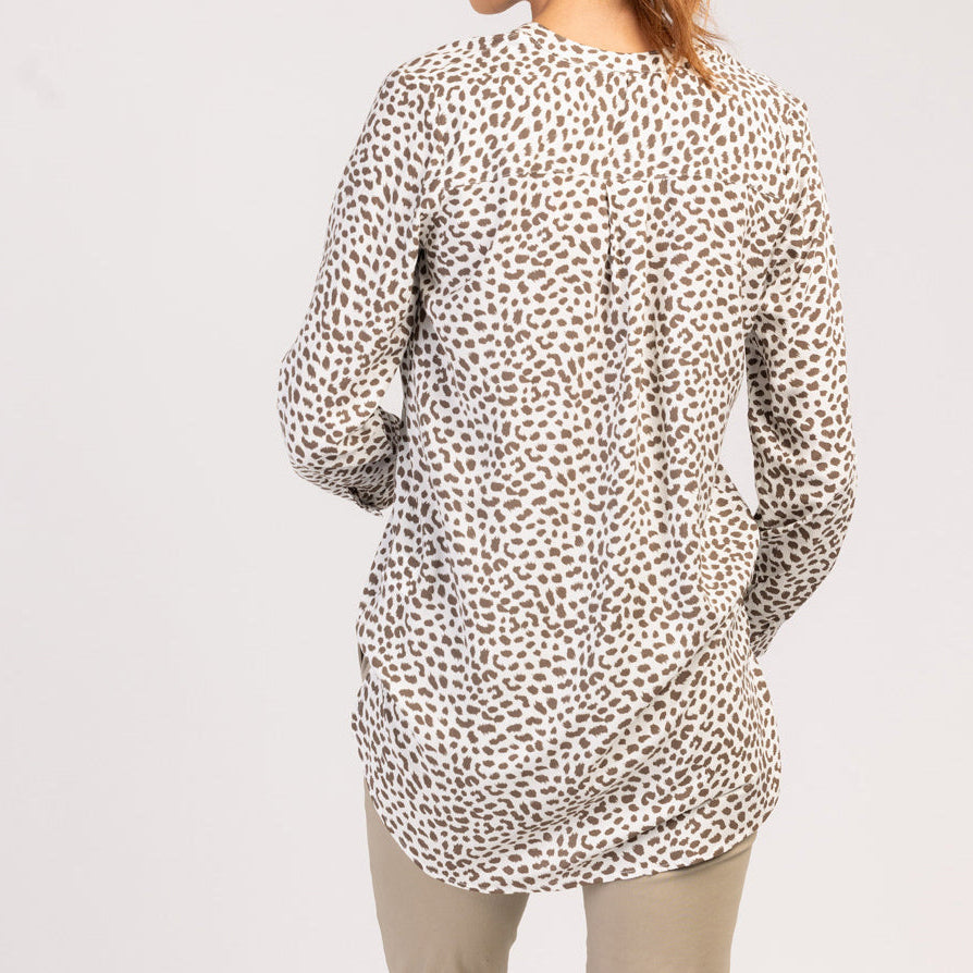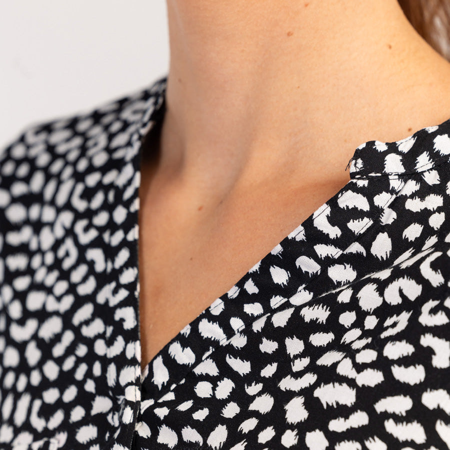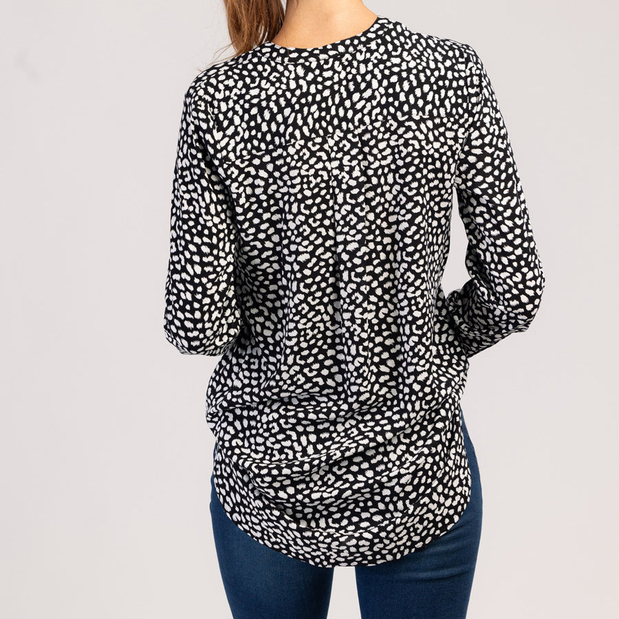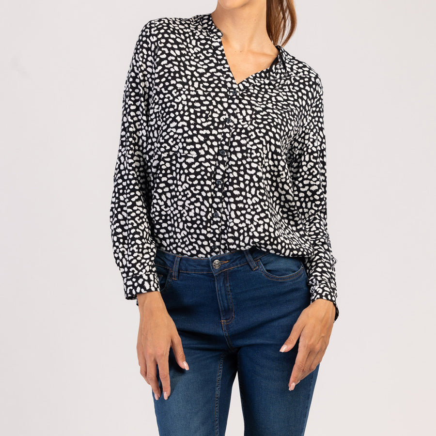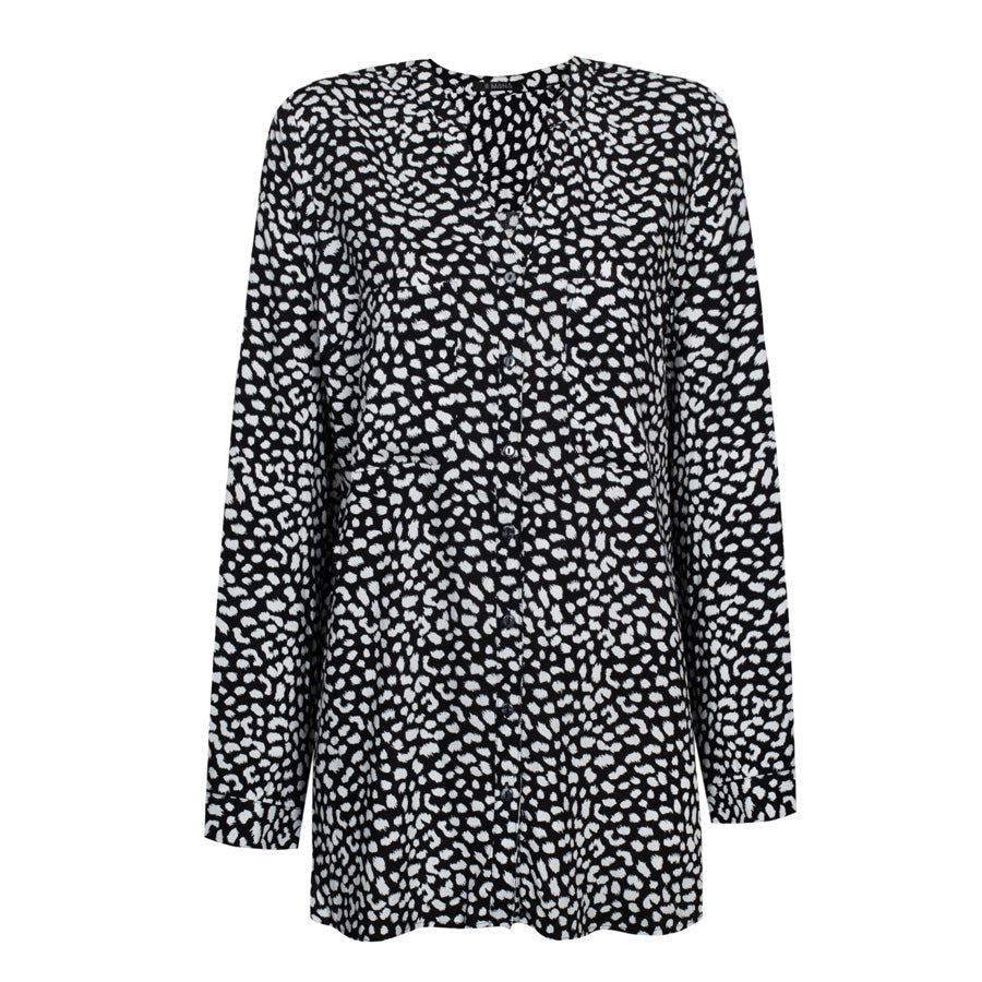 Diese langärmelige Damenbluse mit raffiniertem Schwarz-Weiß-Muster vereint Eleganz und Komfort. Aus weicher Viskose gefertigt, fällt sie wunderschön und ist atmungsaktiv – für ein angenehmes Tragegefühl den ganzen Tag lang.